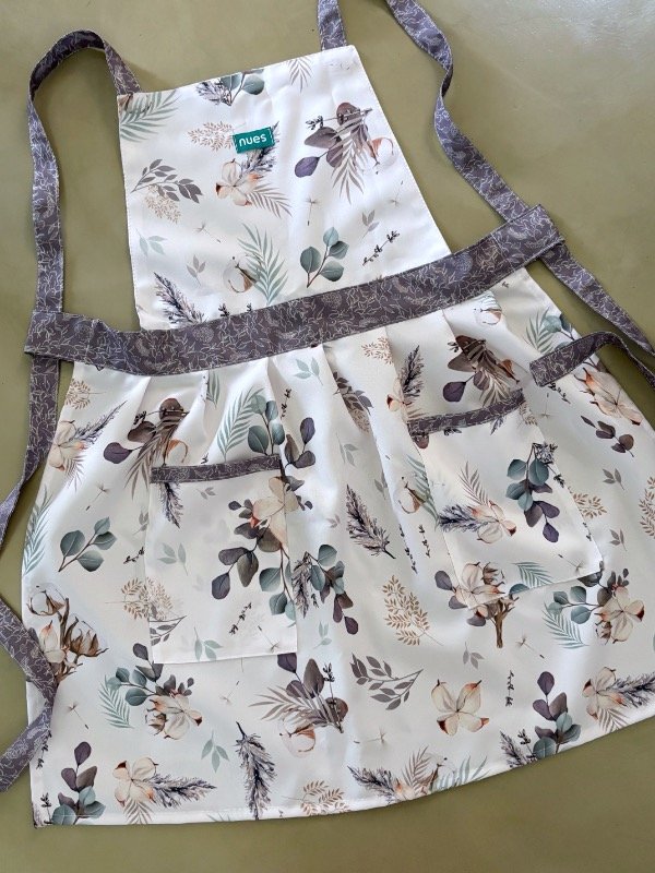 Delantal antimanchas con pechera, falda amplia y bolsillos.